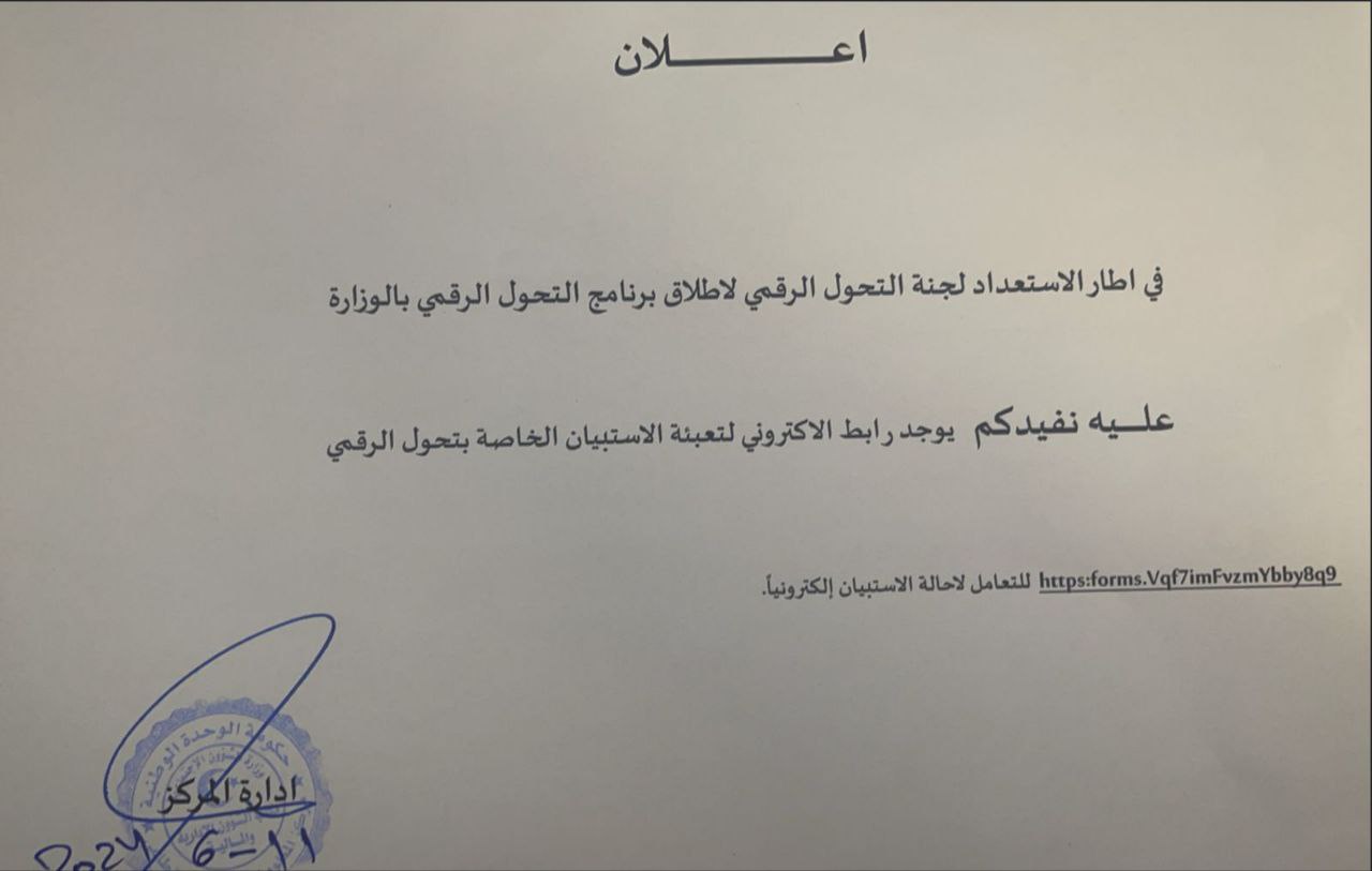 في اطار استعداد لجنة التحول الرقمي لاطلاق برنامج التحول الرقمي بالوزارة عليه نفيدكم بوجود رابط الكتروني لتعبئة الاستبيان الخاصة بالتحول الرقمي https:forms.Vqf7imFvzmYbby8q9 للتعامل لاحالة الاستبيان إلكترونياً