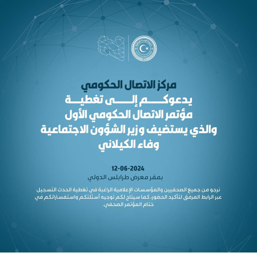 #مركز_الاتصال_الحكومي يدعو الصحفيين والمؤسسات الإعلامية لتغطية المؤتمر الأول للاتصال الحكومي، والذي تشارك فيه وزيرة الشؤون الاجتماعية وفاء الكيلاني، الأربعاء 12-6-2024 على تمام الساعة 16:00 مساء بمعرض طرابلس الدولي. الرجاء التسجيل عبر الرابط لاعتماد بيانات المشاركين في التغطية الإعلامية. https://register.lgcc.gov.ly/ #حكومتنا #ليبيا #حكومة_الوحدة_الوطنية