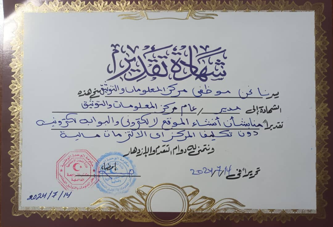 تم تكريم مدير عام المركز من موظفي المركز بشهادة شكر وتقدير وعرفان وذلك لإنجاز الموقع الالكتروني والبوابة الالكترونية للمركز، دون تكليف المركز بأي أعباء او التزامات مالية حيث هذه الاعمال مكلفة، وتم عر...