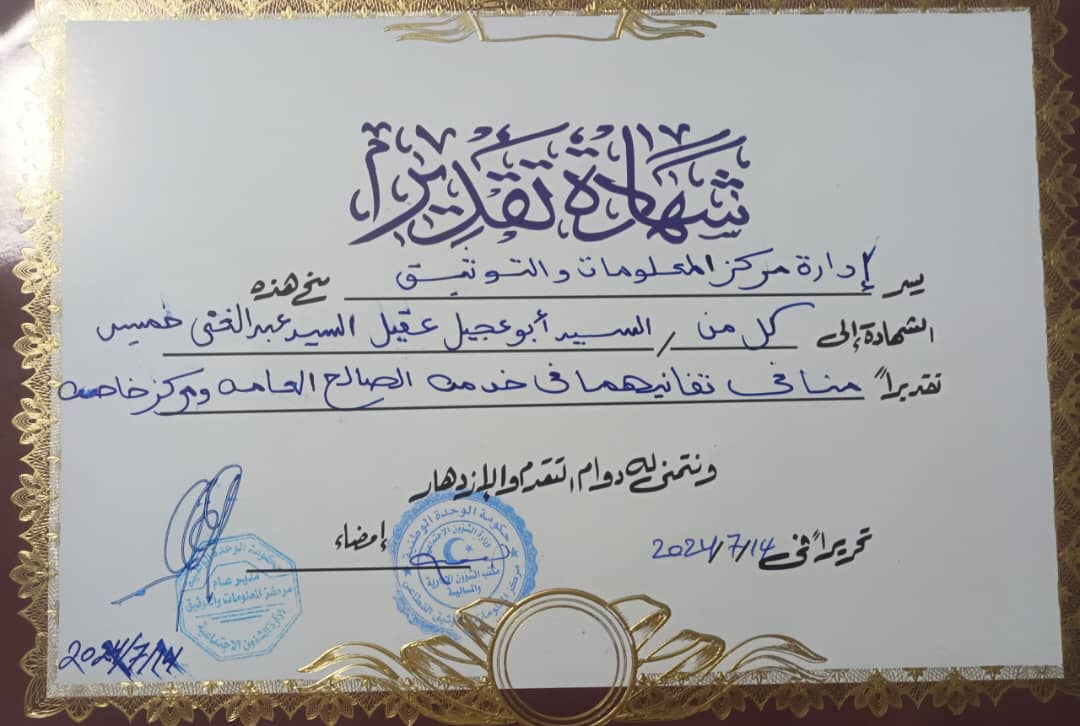 تم تكريم عدد اثنين من موظفي المركز وهم : 1- ابوعجيلة علي عقيل 2- عبدالغني سعيد خميس نظير التزامهم بالعمل